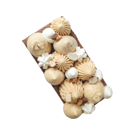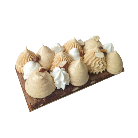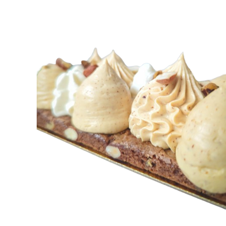 La base de la bûche pralinée est un brownie gourmand au chocolat, aux amandes, aux noisettes et aux noix alliant douceur fondante et texture croquante. La crème mousseline au praliné amandes-noisettes-noix complète parfaitement cette base. Inspirée du célèbre Paris-Brest, cette couche offre une onctuosité et une profondeur de saveur. Une crème chantilly vient apporter une touche de légèreté à ce dessert.